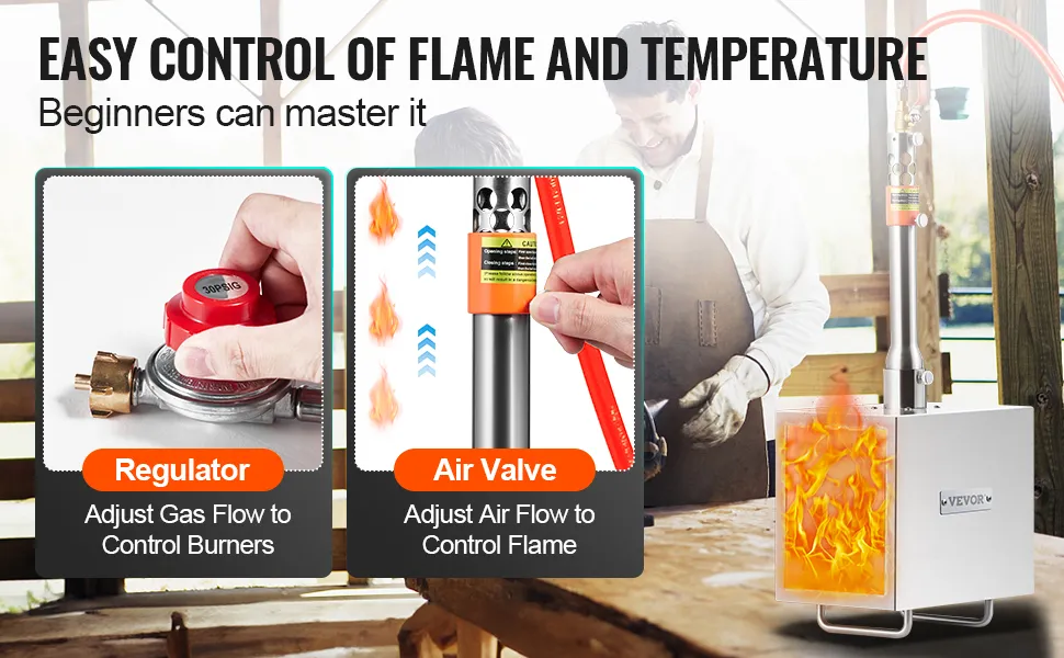 Einfache Bedienung & Temperaturregelung: Die Gasschmieden für Schmiedearbeiten sind mit 1 Brenner ausgestattet. Das Luftventil regelt das Verhältnis von Luft und Propangas und der Regler steuert den Propangasstrom. Diese Einstellungen ermöglichen eine präzise Feuerungs- und Temperaturregelung für verschiedene Metalle wie Gold, Kupfer, Silber, Edelstahl, Stahl, Messing, Bronze, Magnesium, Aluminium, Legierungen, Blei und Zinn.