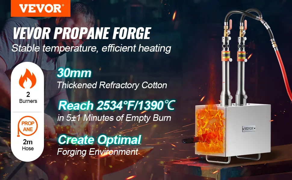 Effizientes Heizen & stabile Temperatur: Die 30 mm dicke, feuerfeste Baumwollkonstruktion der tragbaren Propangasschmiede sorgt für eine effiziente Wärmekonzentration und minimiert Wärmeverluste. In Kombination mit 2 leistungsstarken Brennern wird eine starke und gleichmäßige Hitze erzeugt, sodass die Schmiede schnell eine stabile Temperatur von bis zu 2600 °F (1427 ℃) erreichen und halten kann. Dank seiner überlegenen Leistung können Sie problemlos hochwertige Metallwerkzeuge oder Kunstwerke herstellen.