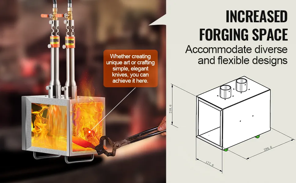 Mehr Platz & flexible Beschickung: Die Schmiede hat ein quadratisches Design, wodurch ein größerer und geräumigerer Innenraum entsteht, der Platz für Metallvorräte unterschiedlicher Größe und Form bietet. Dieses Design unterstützt verschiedene Schmiedeanforderungen, egal ob es sich um Messer, Nägel, Armbänder, Schrauben oder Scheren handelt. Darüber hinaus verbessert der wissenschaftlich konzipierte Innenraum die Heizleistung.