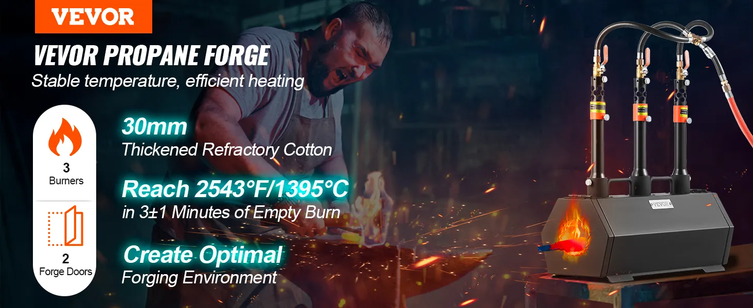 VEVOR Tragbare Propan-Schmiede, Hufschmiede-Schmiede mit 3 Brennern, 1427℃ Gas-Schmiedeofen zur Werkzeug- und Messerherstellung, Sechskant-Gas-Schmiedewerkzeuge und -Ausrüstung aus kaltgewalztem Stahl