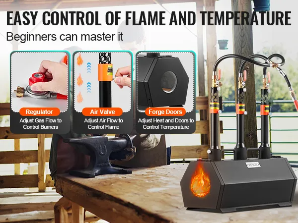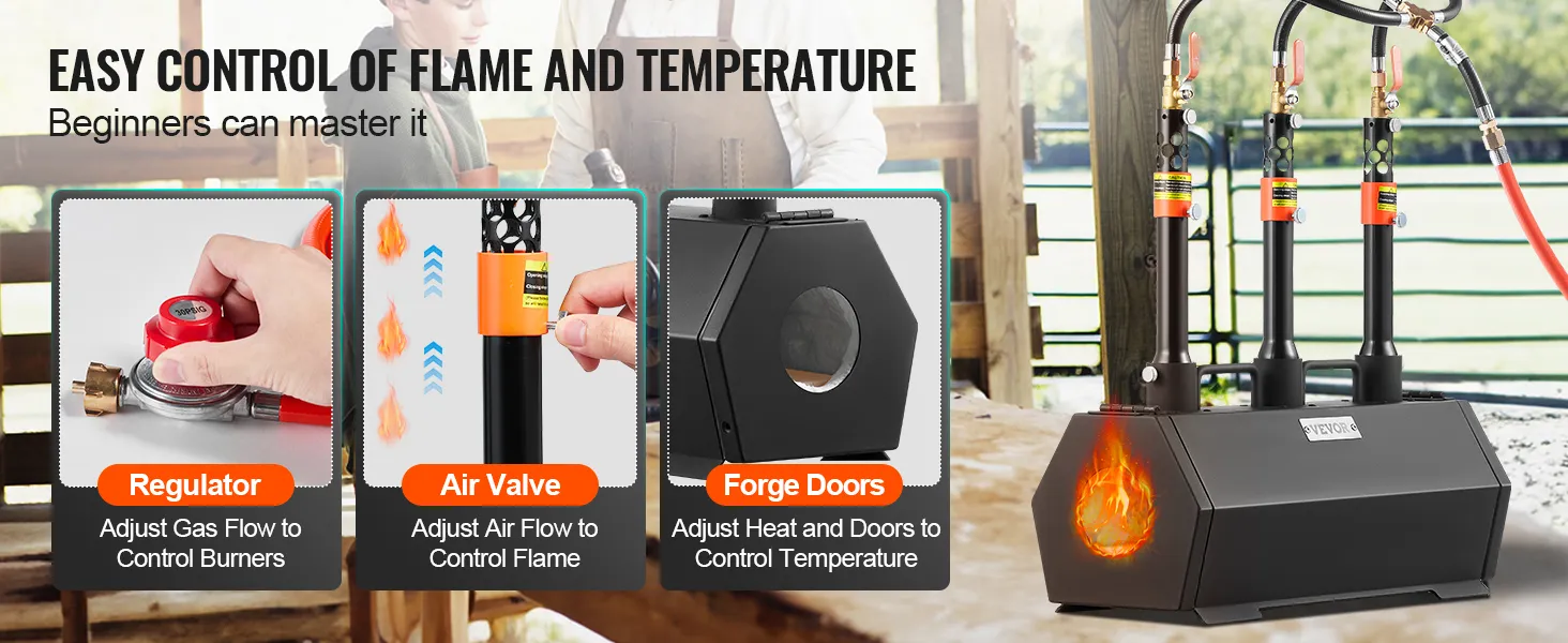 Einfache Bedienung & Temperaturregelung: Die Gasschmieden für Schmiedearbeiten verfügen über 3 Brenner mit einstellbaren Ventilen zur Regelung des Einsatzes von 1, 2 oder allen 3 Brennern. Mit dem Luftventil wird das Verhältnis von Luft zu Propangas eingestellt, und mit dem Regler wird der Propangasstrom geregelt. Diese Einstellungen ermöglichen eine präzise Feuerungs- und Temperaturregelung für verschiedene Metalle wie Gold, Kupfer, Silber, Edelstahl, Stahl, Messing, Bronze, Magnesium, Aluminium, Legierungen, Blei und Zinn.