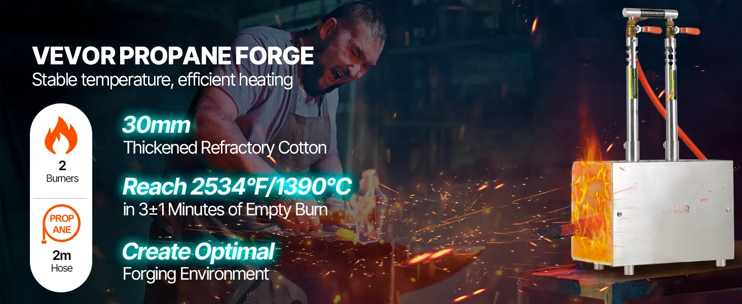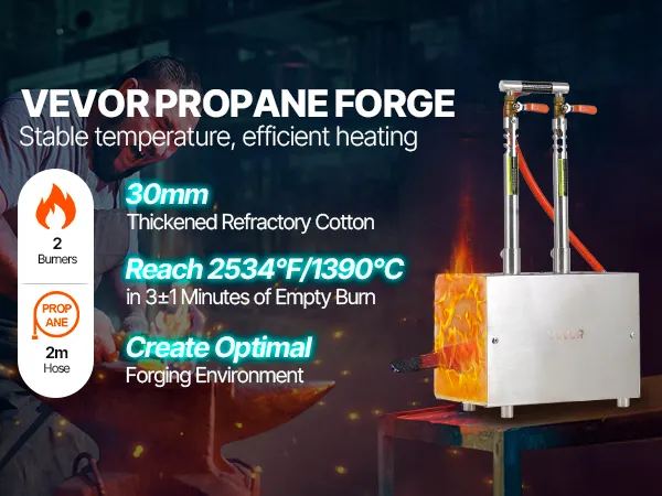 Effizientes Heizen & stabile Temperatur: Die 1,2 Zoll dicke feuerfeste Watte dieser tragbaren Propangas-Schmiede konzentriert die Hitze und minimiert Wärmeverluste. Mit zwei leistungsstarken Brennern erreicht sie schnell 1427 °C und bietet somit ideale Bedingungen zum Schmieden hochwertiger Metallwerkzeuge