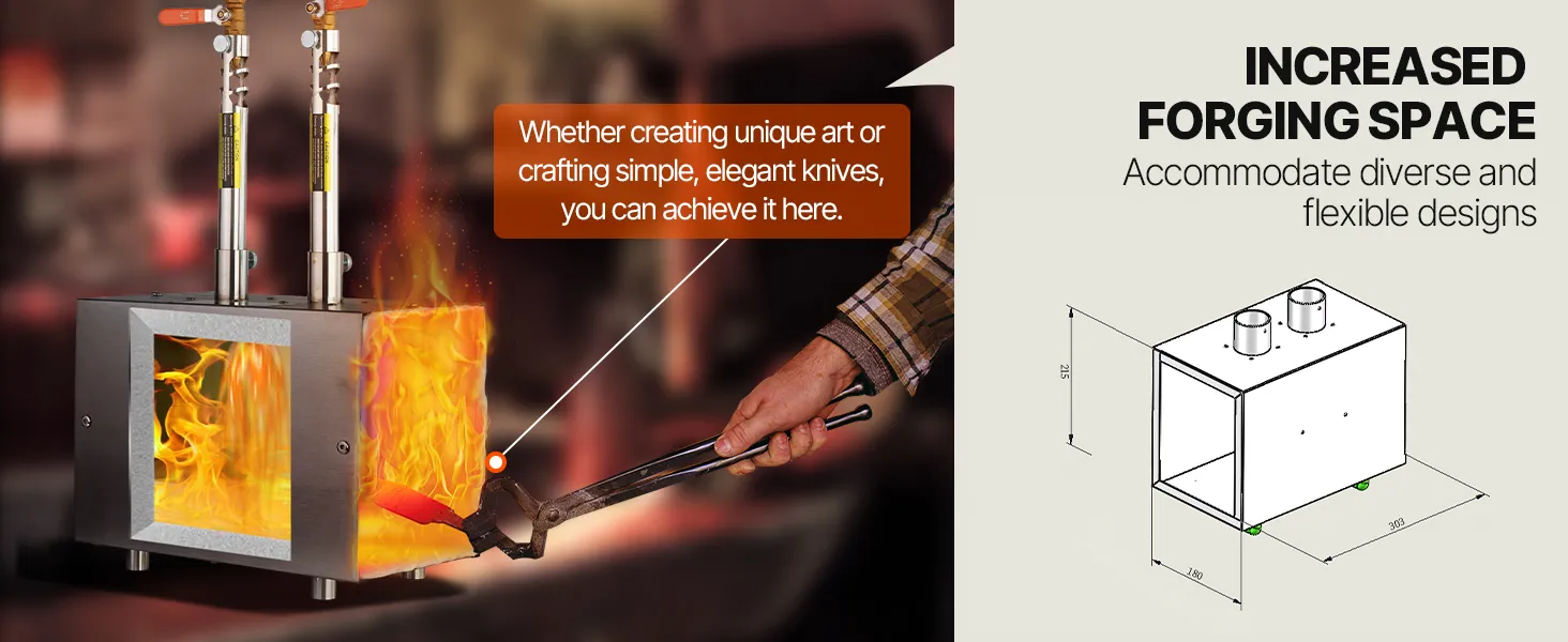Mehr Platz & flexible Beladung: Die quadratische Bauweise der Hufschmiede bietet einen höheren, geräumigeren Innenraum für verschiedene Metallrohlinge, von Messern bis zu Schrauben. Der optimierte Innenraum verbessert zudem die Heizeffizienz und unterstützt so vielfältige Schmiedeanforderungen