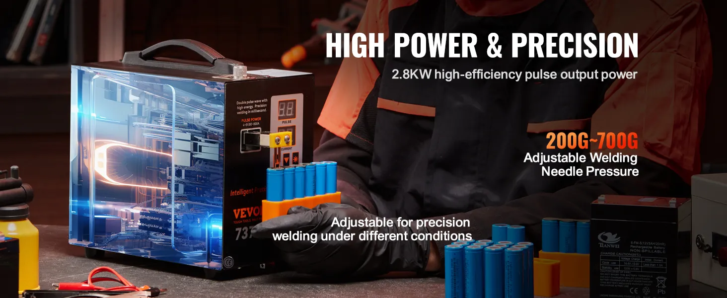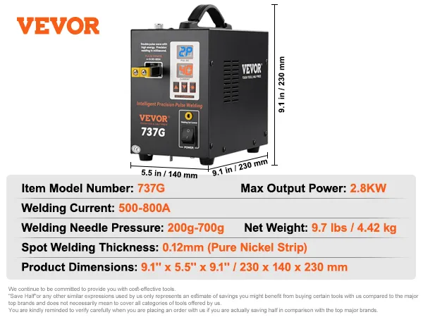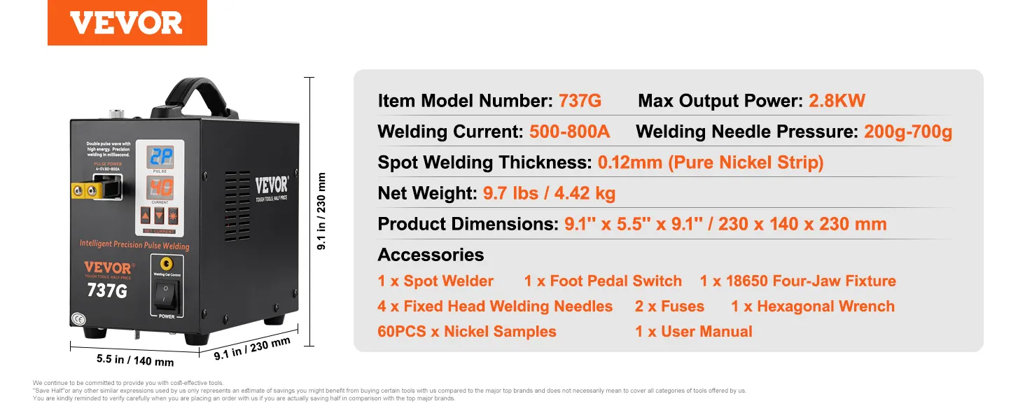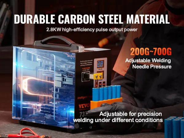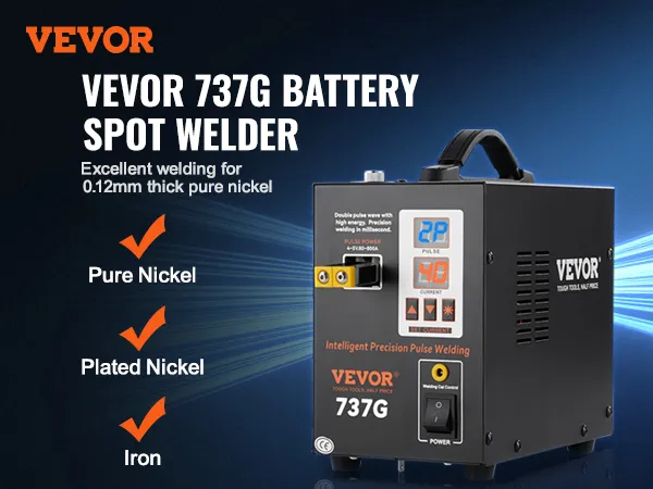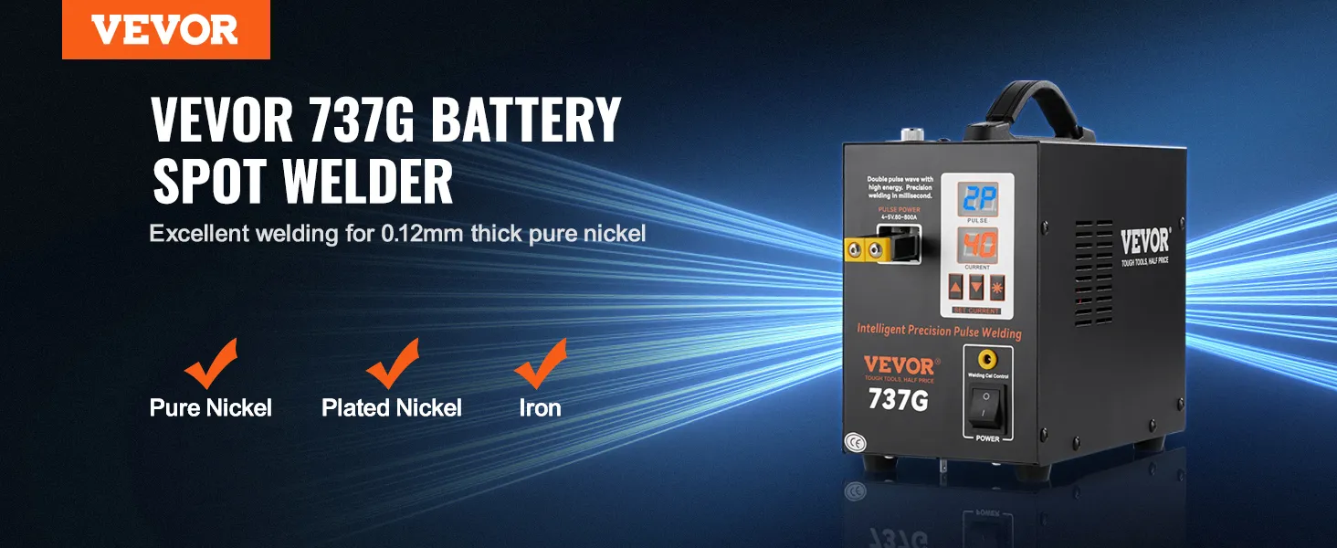 Erhöhte Schweißfestigkeit: Das Akku-Punktschweißgerät VEVOR 737G erleichtert das präzise Schweißen von 0,12 mm dicken Streifen aus reinem Nickel und eignet sich perfekt für die Herstellung von wiederaufladbaren Lithium-Batteriesätzen wie 18650 und 14500 sowie für die Verarbeitung von Materialien aus reinem Nickel, vernickeltem Material und Eisen für verschiedene industrielle Anwendungen .