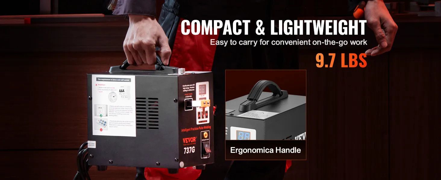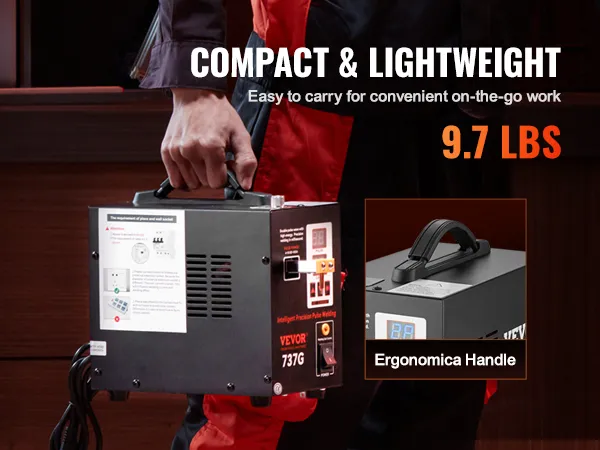 Leicht und tragbar: Das Akku-Pulspunktschweißgerät VEVOR 737G ist kompakt, leicht und mit dem Griff einfach zu transportieren. Im Vergleich zu herkömmlichen großen, sperrigen Punktschweißgeräten ist es kleiner und leichter, aber dennoch leistungsstärker und zuverlässiger in der Funktionalität.