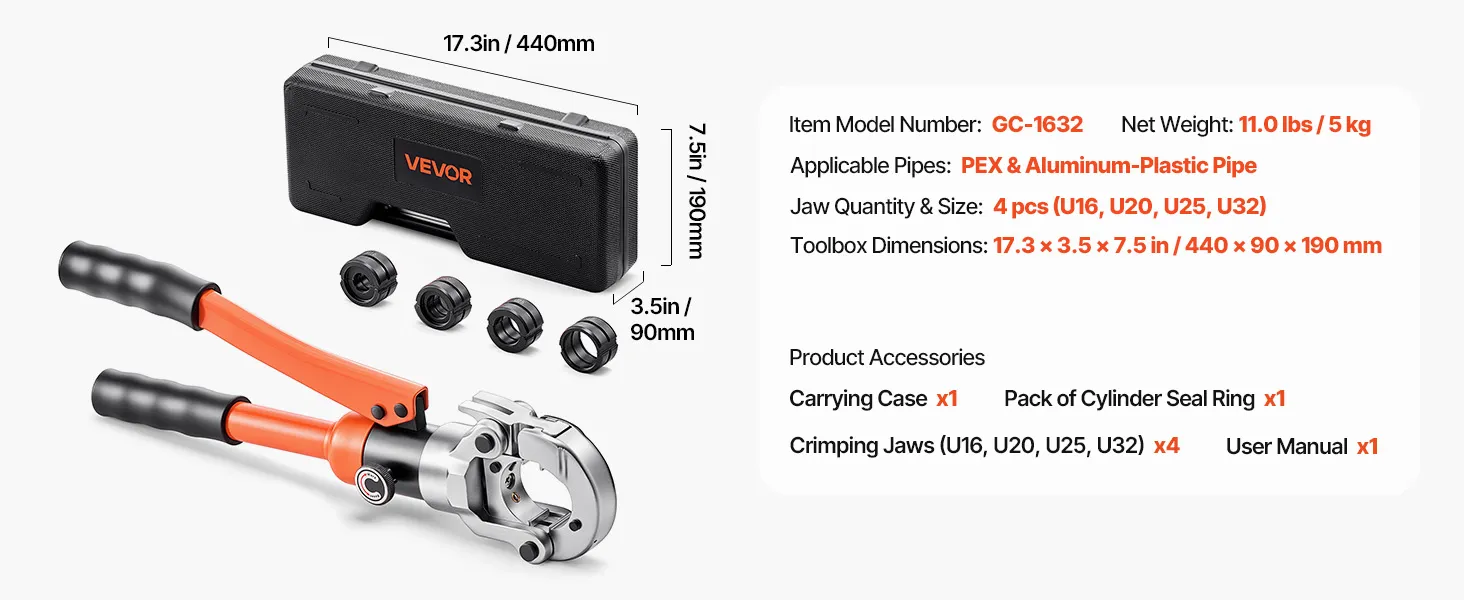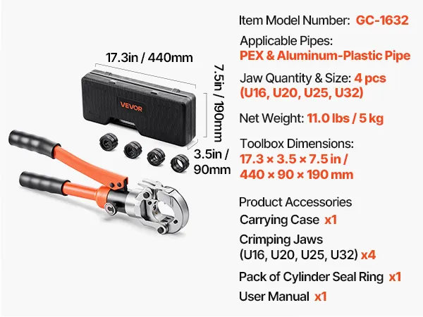 Das hydraulische Rohrverpresswerkzeug von VEVOR verfügt über vier Verpressbacken (U16, U20, U25, U32) für PEX- und Aluminium-Kunststoff-Rohre. Dank eines fortschrittlichen Hydraulikantriebs ermöglicht es schnelle, leckagefreie Verpressungen und sichere Verbindungen für ein breites Anwendungsspektrum im Rohrleitungsbereich.