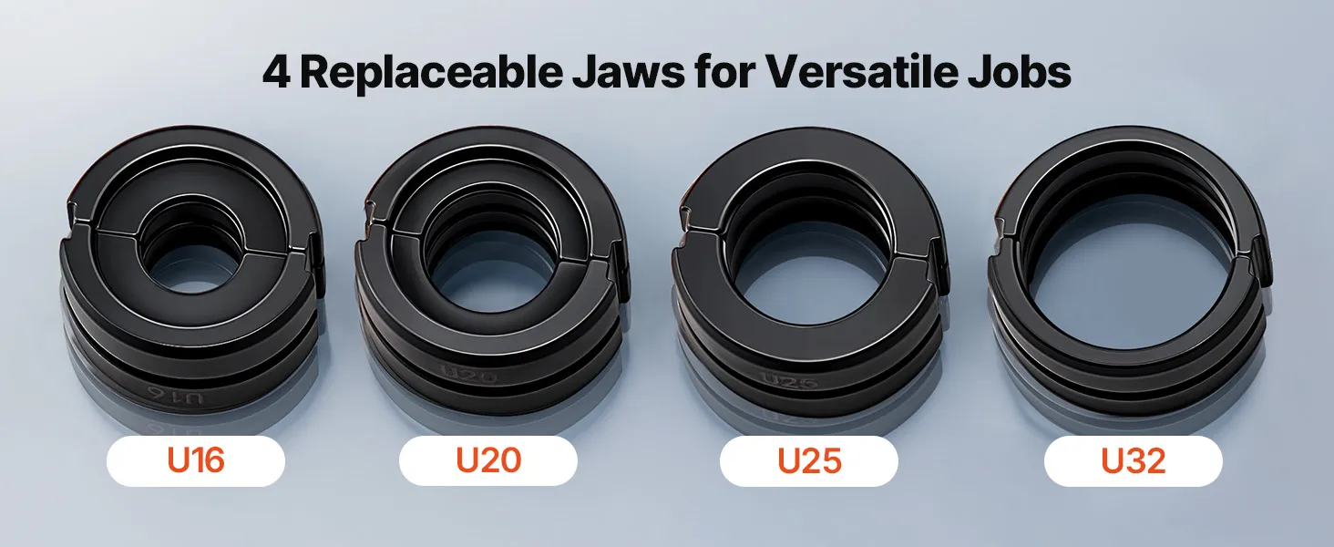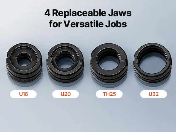 Enthält 4 austauschbare Backen (U16, U20, U25, U32) für flexible Anwendung an verschiedenen Rohrgrößen. Erzielen Sie mühelos schnellere, präzisere und hochwertigere Verpressungen.