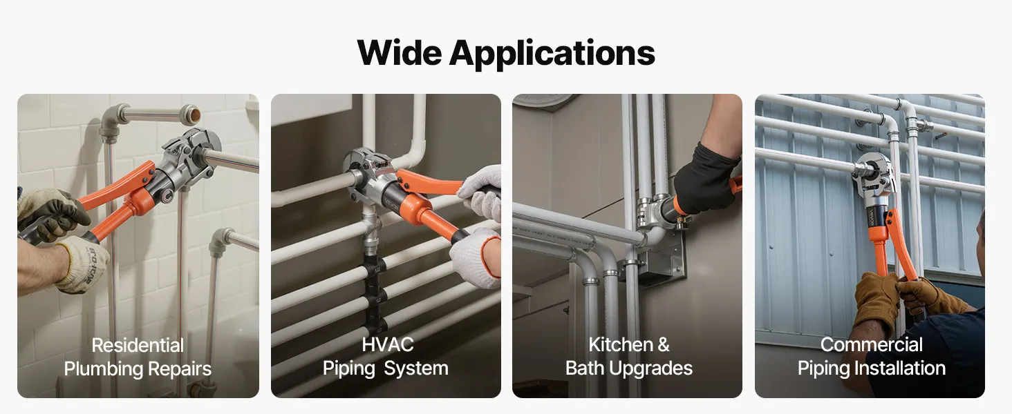 Breites Anwendungsspektrum: Ob für die Rohrinstallation und -reparatur in der Hausinstallation, in HLK-Systemen oder bei industriellen Rohrleitungsprojekten – unser hydraulisch betriebenes Rohrpresswerkzeug sorgt für stabile und sichere Rohrverbindungen und gewährleistet so eine effiziente und zuverlässige Leistung.