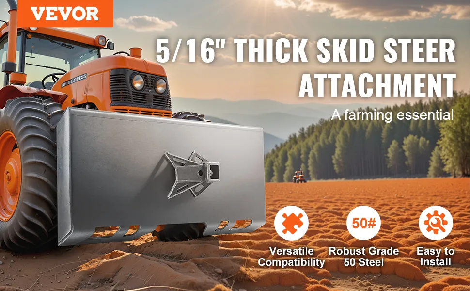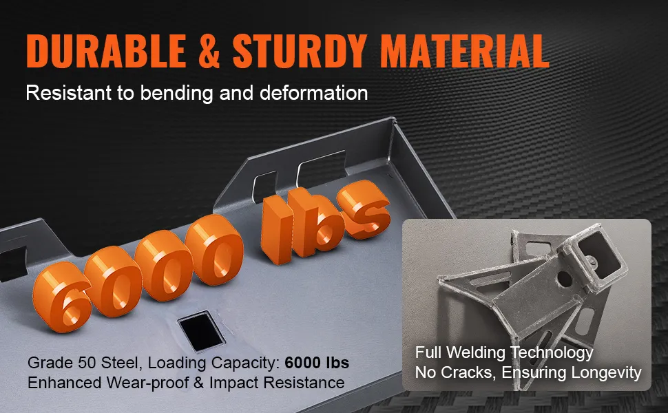 Die VEVOR-Anbauplatte für Kompaktlader ist aus robustem 50er-Stahl gefertigt. Diese Konstruktion gewährleistet die Langlebigkeit und Zuverlässigkeit der Platte. Der Stahl ist von hoher Qualität, was bedeutet, dass er starker Beanspruchung standhält. Die Platte ist für harte Bedingungen und anspruchsvolle Aufgaben ausgelegt. Sie ist stark genug, um schwere Lasten zu tragen, ohne Kompromisse bei der Leistung einzugehen. Sie können dieser Platte für verschiedene Projekte vertrauen, ohne sich um Verschleiß sorgen zu müssen. Unsere robuste Konstruktion hält die Platten jahrelang funktionsfähig. Die lange Haltbarkeit steigert den Wert der Platte und macht sie zu einem zuverlässigen Werkzeug.