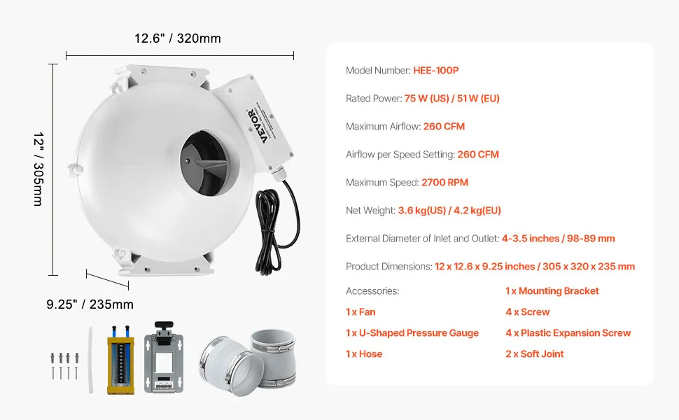 VEVOR 98-89mm Radon-Lüfter-Installationskit, 260CFM Radon-Minderungs-Lüftersystem-Kit mit 2 Kupplungen, Druckanzeige, Inline-Kanalventilator-Abluftventilator für die Belüftung im Innen- & Außenbereich