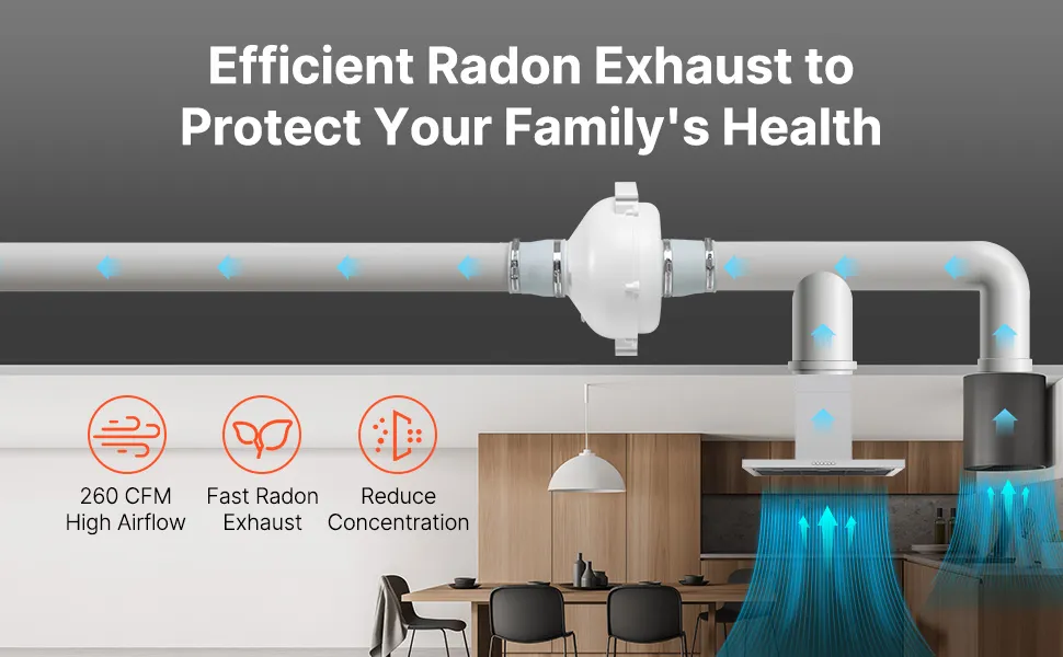 Mit einem Luftstrom von 260 CFM senkt dieser Radonventilator schnell die Radonkonzentration in Innenräumen und sorgt für eine gesunde Atemumgebung für Ihre Familie.