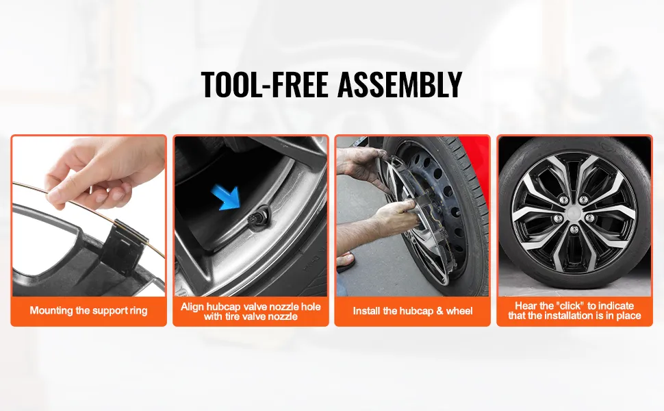 Zerstörungsfreie Installation: Das Clip-Design macht die Installation schneller und einfacher. Vorbereitete Luftdüsenlöcher müssen nicht geändert werden. Durch leichtes Drücken wird die Radkappe ohne Werkzeug sicher an der Radnabe befestigt und fällt beim Fahren auf holprigen Straßen nicht so leicht ab.