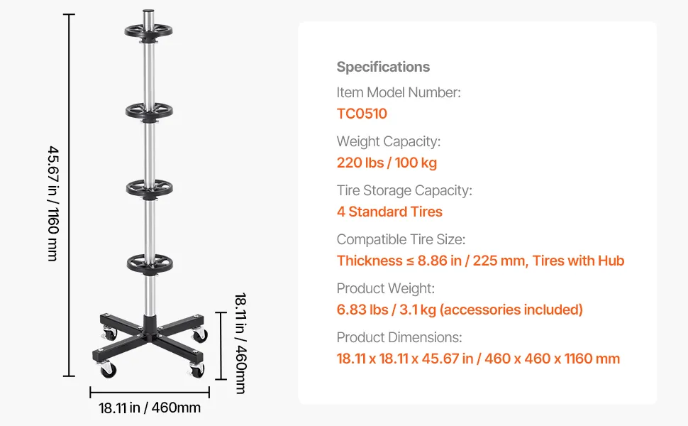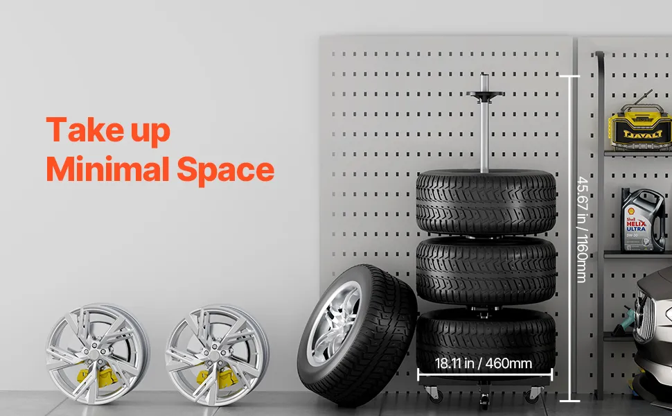 Maximierte Raumeffizienz: Mit einer Breite von 460 mm (18,11 Zoll) und einer Höhe von 1160 mm (45,67 Zoll) nutzt dieser baumförmige Reifenständer den vertikalen Raum, ohne viel Bodenfläche einzunehmen, und trägt dazu bei, Ihre Garage, Werkstatt oder Ihr Zuhause sauber und ordentlich zu halten.