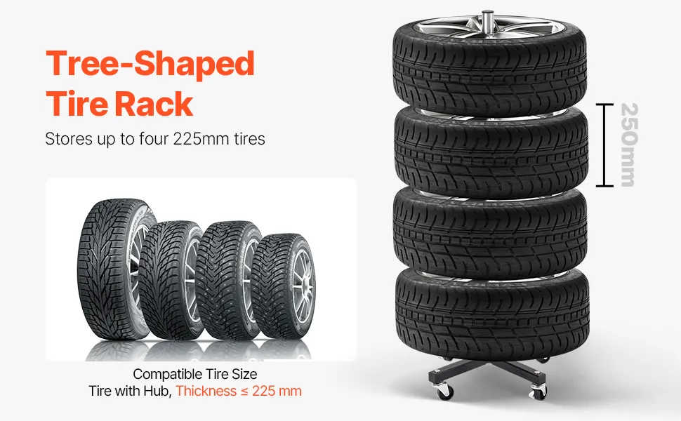 Dieser 4-Rad-Reifenständer kann bis zu 4 Standardreifen mit Felgen aufnehmen und eignet sich für Reifen mit einer Breite von bis zu 225 mm. Sein robuster, rostfreier Rahmen aus Q235-Stahl trägt bis zu 100 kg und bietet eine zuverlässige, langfristige Lagerung.
