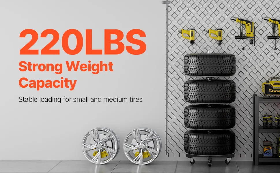 Hohe Tragfähigkeit: Mit einer robusten Gewichtskapazität von bis zu 100 kg (220 lbs) kann dieser mobile Reifenhalter bis zu 4 Reifen mit Felgen (bis zu 8,86 Zoll / 225 mm Breite) sicher halten und bietet eine zuverlässige Aufbewahrungslösung, mit der Sie Ihre Reifen ordentlich aufbewahren können.