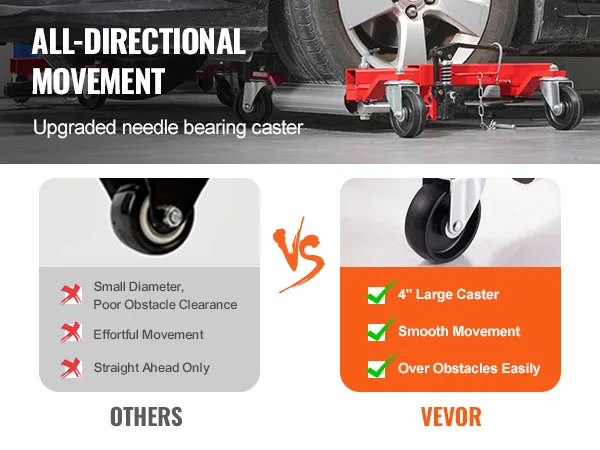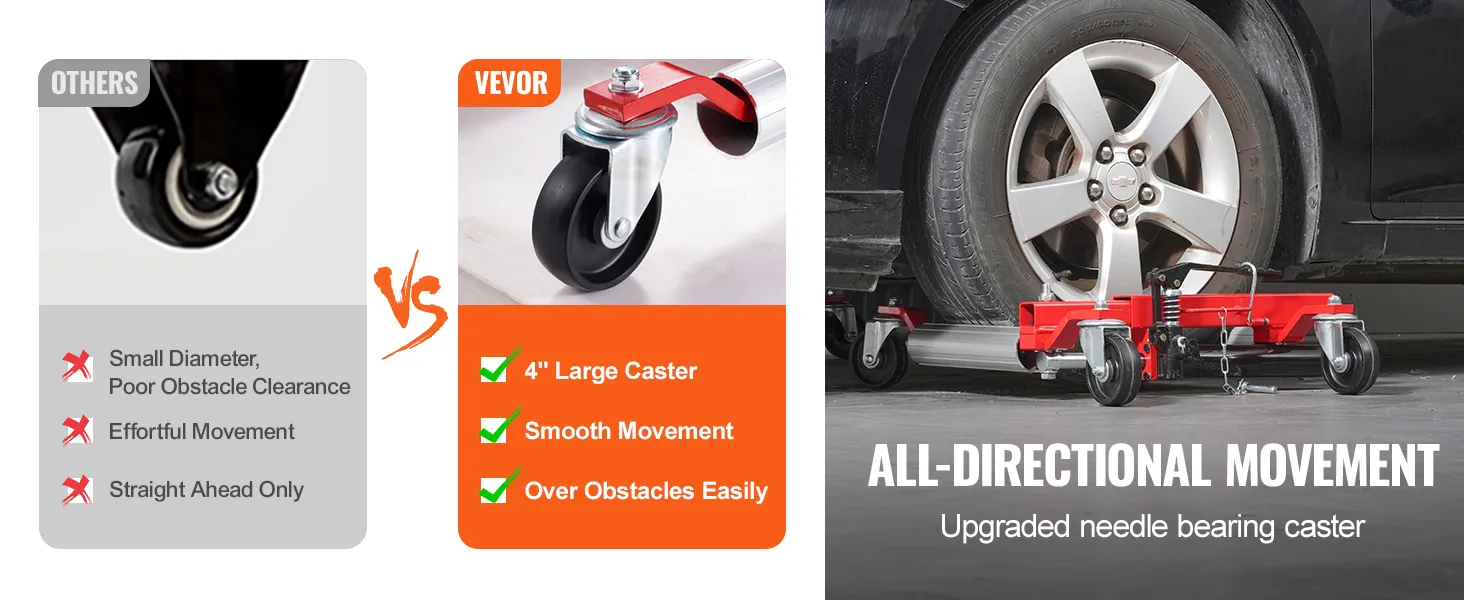 Unsere Wagenheber für Autos verfügen über 4-Zoll-Universalrollen, mit denen sich das Fahrzeug problemlos in jede Richtung bewegen lässt. Reduzieren Sie den Arbeitsaufwand und verhindern Sie ungewollte Bewegungen. Sichern Sie die gewünschte Position durch einfaches Drücken der Fußbremse.