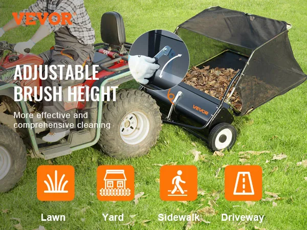 Adapt to Diverse Terrains: Our tow behind lawn sweeper can be easily adjusted the spinning brush height by hand, enabling seamless use on any landscape—sidewalks, driveways, yards, or gardens. No terrain is too tricky for this versatile lawn sweeper.