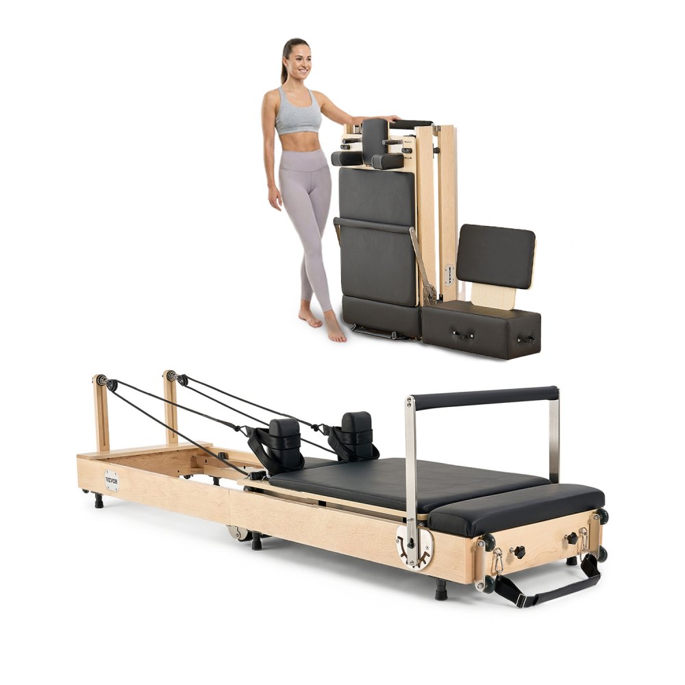 VEVOR Foldable Wooden Pilates Reformer Training Device for Home Gym Use, Pilates Bed with Dual Resistance – Spring & Cord, Equipment with Seat Box, up to 181.44 kg