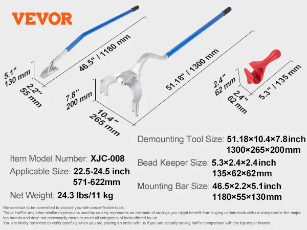 Mit dem VEVOR-Reifenwechsler für LKWs können Sie Reifen schnell und einfach wechseln. Er ist für 22,5-24,5-Zoll-Reifen ausgelegt, darunter Radialreifen, Diagonalreifen und schlauchlose Reifen. Die robuste Konstruktion des Werkzeugs sorgt für zuverlässige Leistung. Sie können damit Reifen entfernen, ohne die Felgen zu beschädigen. Mit diesem Werkzeug können Sie Reifen ganz einfach und ohne Zeit- oder Arbeitsaufwand entfernen. Es spart Zeit und ist ein unverzichtbares Werkzeug für alle, die häufig Reifen wechseln müssen. Verwenden Sie es für verschiedene Reifen, von LKWs bis hin zu landwirtschaftlichen Geräten. Dieses Produkt ist für jeden Reifenservice-Profi unverzichtbar.