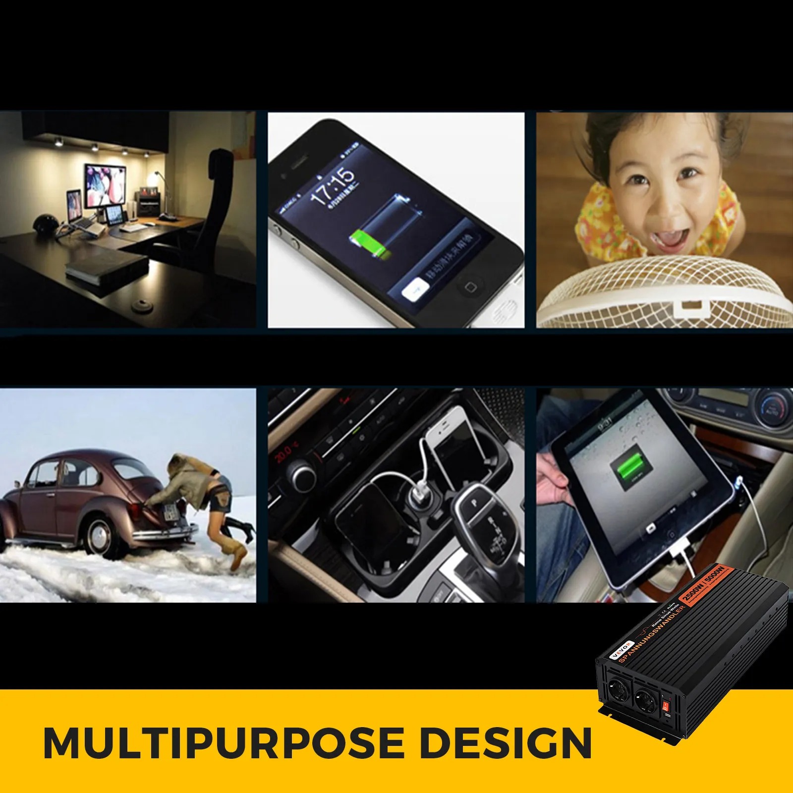 Dieser Wechselrichter kann alle Arten von Geräten zu Hause oder im Büro mit Strom versorgen, einschließlich motorbetriebener Geräte wie Röhrenlampen, Ventilatoren, Kühlschränke und Klimaanlagen.