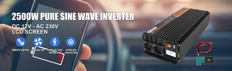 • 【AUSGEZEICHNETE LEISTUNG】 - Ein reiner Sinus-Wechselrichter mit 2500 W kann Gleichstrom von 12 V in Wechselstrom von 230 V mit einem Wirkungsgrad von bis zu 94 % umwandeln, sodass Sie ihn für 12-V-Elektrik und Standard-230-V-Geräte verwenden können.
