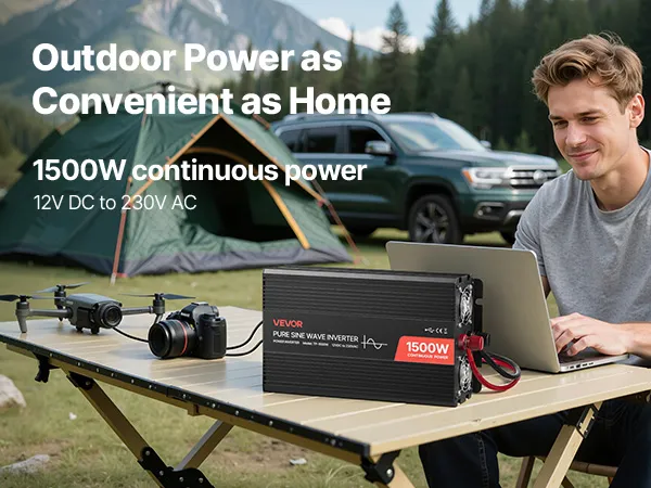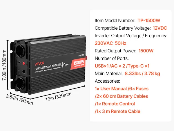 VEVOR 1500-W-Wechselrichter, 12 V DC auf 230 V AC, reiner Sinus-Wechselrichter, mit Fernbedienung, USB- & Typ-C-Anschlüsse, 2 AC-Steckdosen, Schnellladung für RV, LKW, Outdoor-Camping