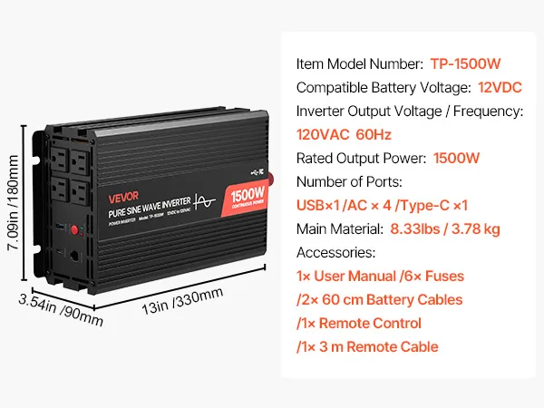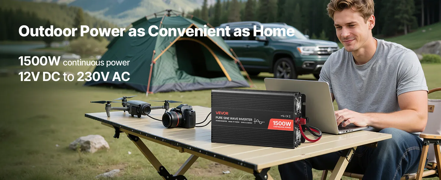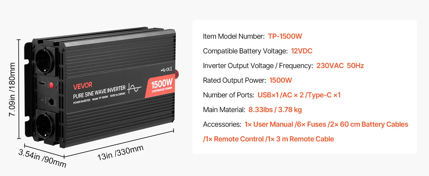 VEVOR 1500W Power Inverter, 12V DC to 230V AC Pure Sine Wave Inverter, Car Charger Converter with Remote Control, USB & Type-C Ports, 2 AC Outlets, Fast-charging for RV, Truck Outdoor Camping