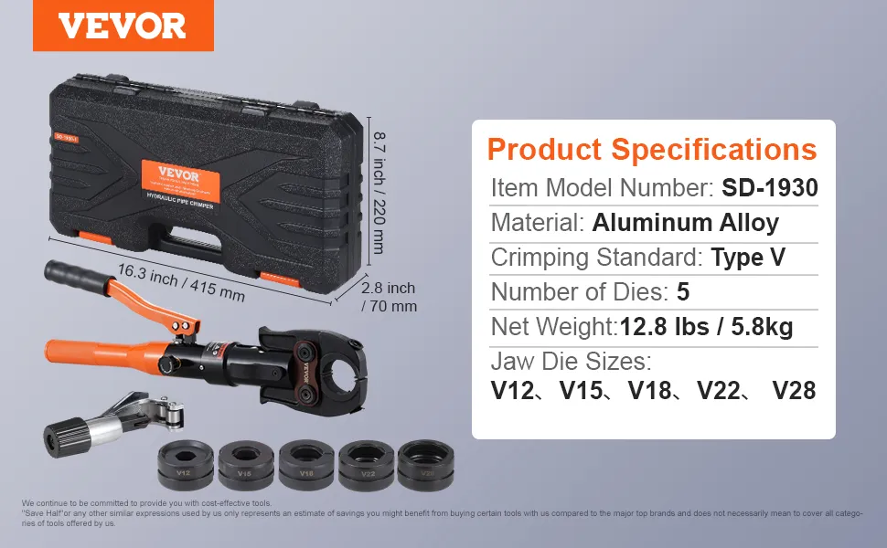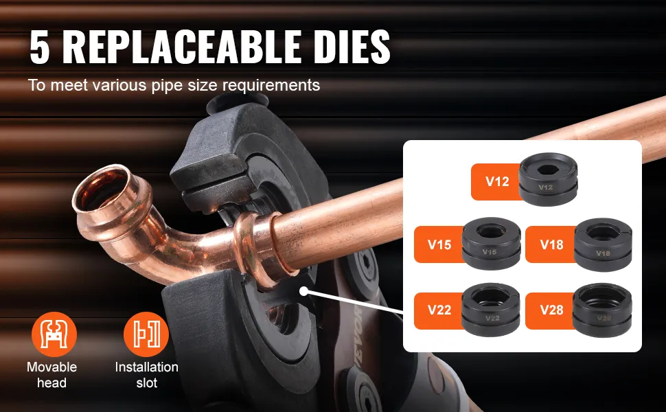 Vielseitige Matrizenkompatibilität: Dieses professionelle Presswerkzeug für Kupferrohre ist mit 5 Matrizen für die Größen V12, V15, V18, V22 und V28 ausgestattet, erfüllt die Crimpanforderungen für verschiedene Rohrgrößen und ist für verschiedene Industriestandards geeignet.