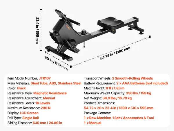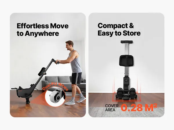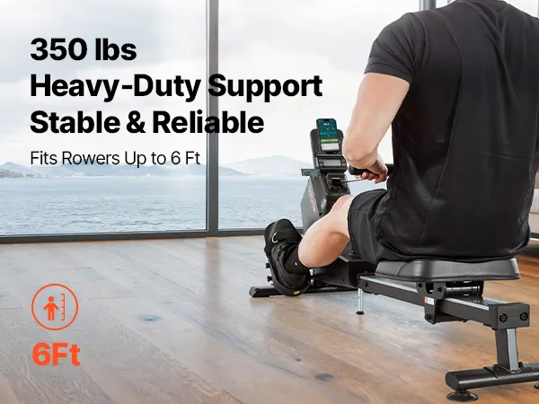 Das robuste Rudergerät unterstützt bis zu 350 lbs (158 kg) und ist für alle Körpertypen geeignet. Es gewährleistet stabiles und sicheres Rudern. Leichtgängige Doppelräder ermöglichen einfaches Bewegen und die vertikale Lagerung spart Platz.