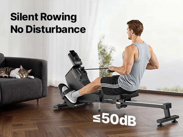 Ruhiges Rudererlebnis: Das faltbare Rudergerät mit reibungslosem Magnetwiderstand läuft unter 50 dB und ist somit ideal für nächtliches Training, ohne die Nachbarn zu stören. Es ist leiser als Wasser- oder Luftrudergeräte, ohne Spritz- oder Lüftergeräusche