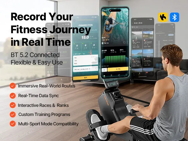 BT 5.2 & Echtzeit-Tracking: Das magnetische Rudergerät unterstützt Kinomaps über eine BT 5.2-Verbindung für ein immersives virtuelles Training, um motiviert zu bleiben und Ihren Trainingsverlauf täglich zu verfolgen und zu speichern, um Ihren Fortschritt zu sehen und bei jeder Sitzung motiviert zu bleiben