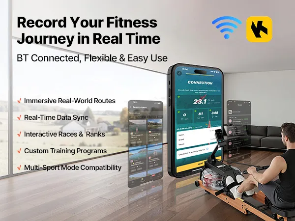 BT-Verbindung & Echtzeit-Tracking: Das Rudergerät unterstützt Kinomaps über eine BT-Verbindung für ein immersives virtuelles Training, um motiviert zu bleiben und Ihren Trainingsverlauf täglich zu verfolgen und zu speichern, um Ihren Fortschritt zu sehen und bei jeder Sitzung motiviert zu bleiben