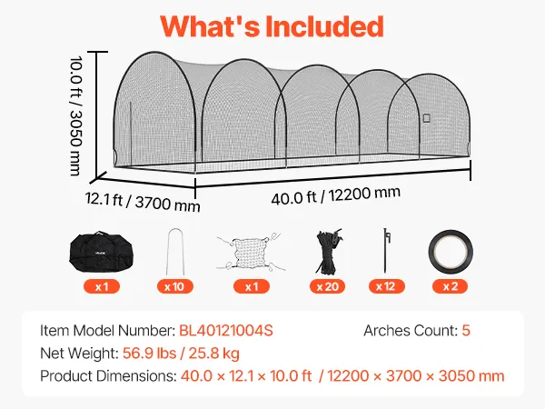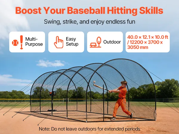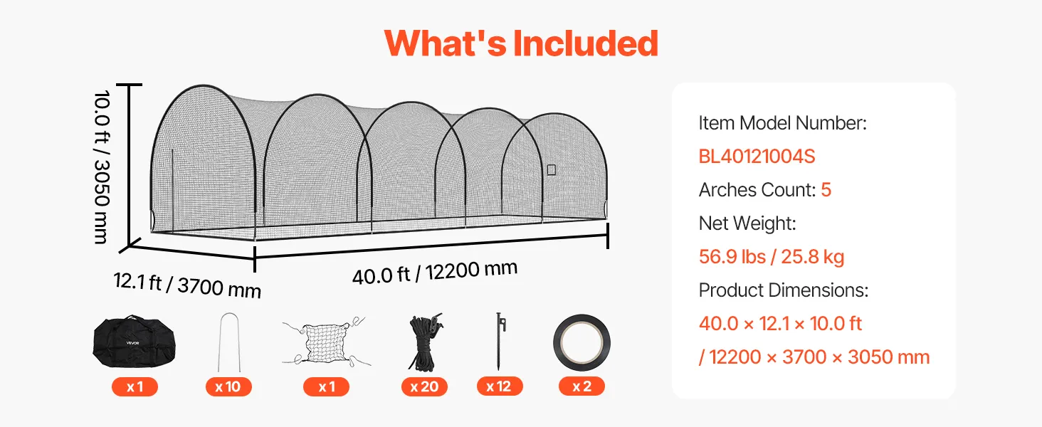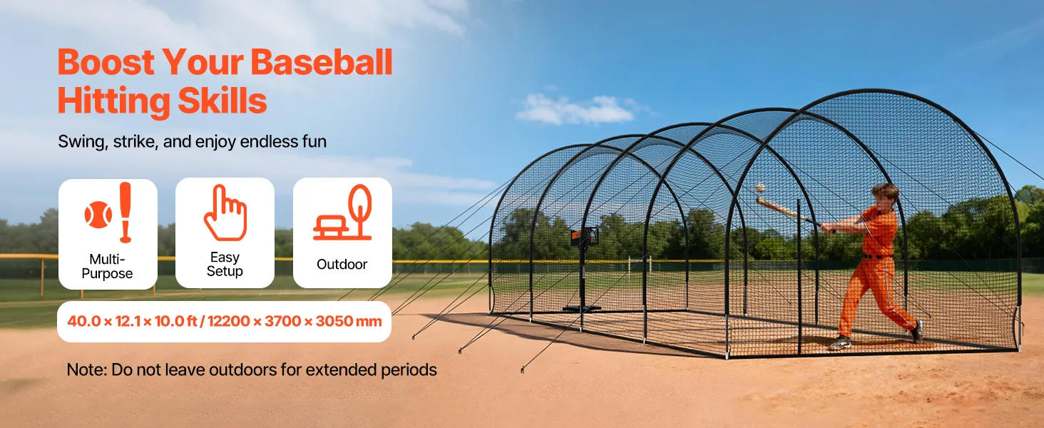 Großzügiger Trainingsbereich: Mit den Maßen 1220 x 370 x 305 cm (40,0 x 12,1 x 10,0 Fuß) bietet unser Schlagkäfignetz ausreichend Platz für Athleten, Trainer und Coaches, um effizient zu trainieren. Die vollständig geschlossene Konstruktion hält die Bälle sicher im Inneren und eignet sich ideal für das Training im Innen- und Außenbereich, egal ob Baseball oder Softball