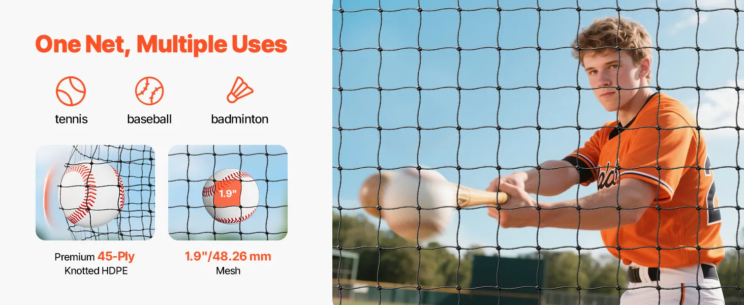 Dieser Schlagkäfig aus verstärktem HDPE-Netz bietet ein feinmaschiges Gewebe, das auch starken Baseballschlägen standhält. Das lichtbeständige Material behält seine Eigenschaften auch bei Sonneneinstrahlung.