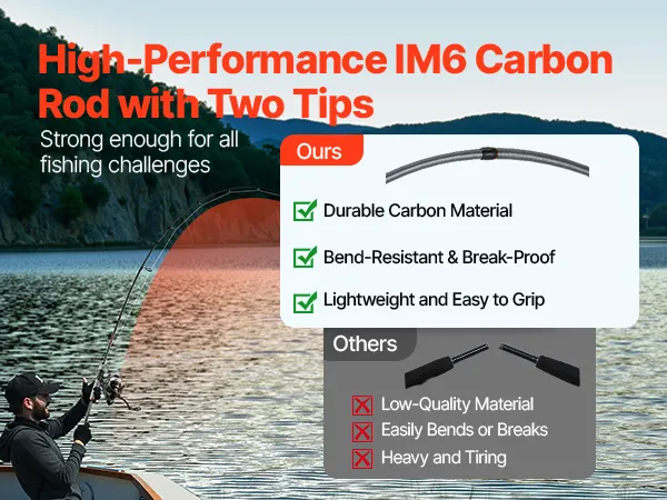 Diese Angelrute kombiniert robuste Kohlefaser mit einer Doppelspitzenkonstruktion für überragende Biegefestigkeit und Langlebigkeit. Dank ihres geringen Gewichts ermüden Sie auch nach stundenlangem Angeln weniger und können selbst kräftige Bisse verschiedenster Fische mühelos bewältigen – für ein noch angenehmeres Angelerlebnis.