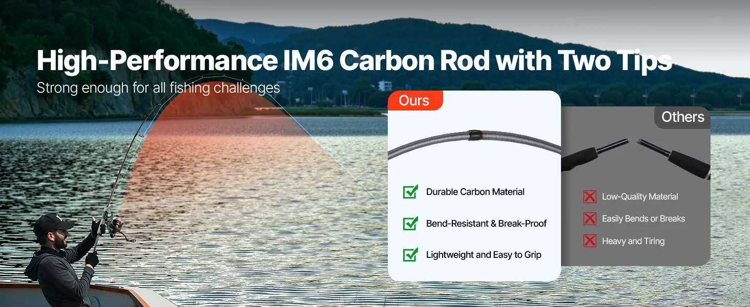 Langlebige Materialien: Diese aus IM7-Kohlefaser gefertigte Angelruten-Kombination ist leicht und gleichzeitig robust und ermöglicht stundenlanges, ermüdungsfreies Angeln. Dank der M/MH-Doppelspitze können Sie mühelos zwischen verschiedenen Angeltechniken wechseln und sich so ideal für unterschiedlichste Angelreviere eignen