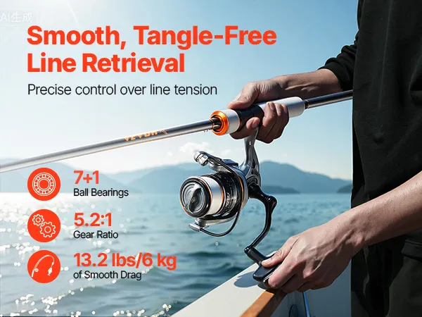 Reibungsloser Lauf: Ausgestattet mit 7 + 1 hochpräzisen Kugellagern und einer Übersetzung von 5,2:1, gewährleistet diese Süßwasser-Angelrute einen gleichmäßigen und flüssigen Schnureinzug. Ob beim Drill eines starken Fisches oder beim Einholen eines leeren Hakens – sie arbeitet zuverlässig und steigert so Ihre Angeleffizienz und Ihr gesamtes Angelerlebnis