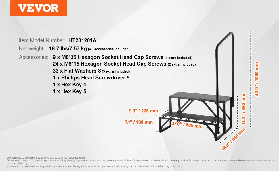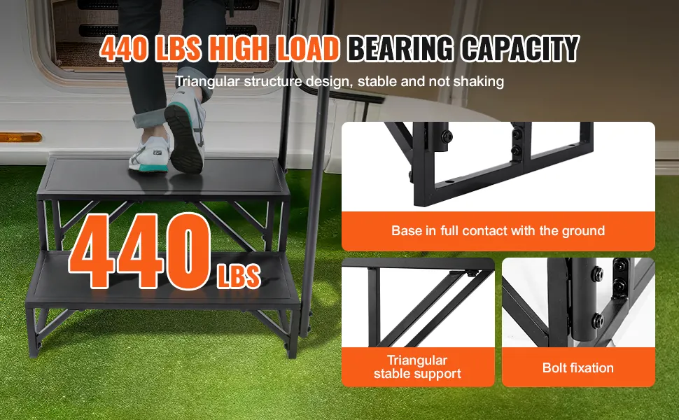 Die VEVOR RV-Stufen zeichnen sich durch einen einfachen und schnellen Montageprozess aus. Sie sind im Handumdrehen fertig. Die verstärkte Struktur sorgt für Stabilität beim Ein- und Aussteigen. Der Boden ist mit einer dreieckigen Stütze und einer zusätzlichen Bolzenverstärkung verstärkt. Die Basis berührt vollständig den Boden und sorgt so für Stabilität. Dieses Design verhindert Wackeln oder Schütteln während der Verwendung der Stufen. Die klaren Anweisungen machen den Aufbauprozess reibungslos und die Stufen der Stufe sind im Handumdrehen einsatzbereit!
