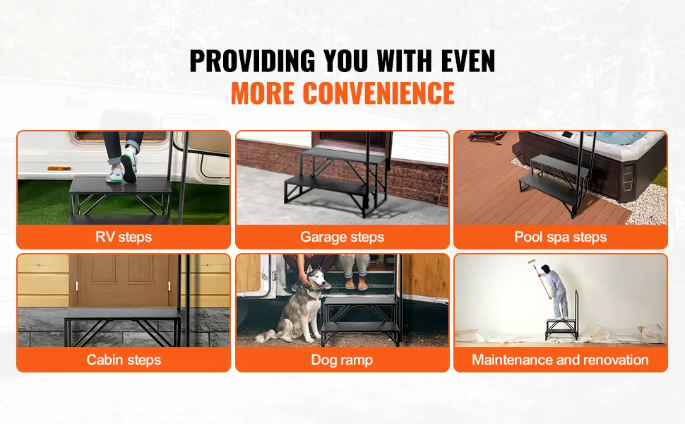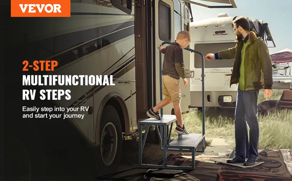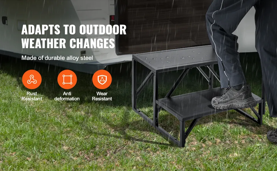 Deshalb sind die VEVOR RV-Stufen so konstruiert, dass sie den Elementen standhalten. Die Stahlleiteroberfläche ist mit einer schwarzen Pulverbeschichtung versehen, die eine hohe Rostbeständigkeit und Haltbarkeit bietet. Dies stellt sicher, dass die Stufen auch bei Regen oder Schnee in gutem Zustand bleiben. Darüber hinaus erleichtert das rostbeständige Material die Wartung der Stufen und garantiert eine lang anhaltende Leistung und ein sauberes Erscheinungsbild. Sie können diese Stufen im Freien verwenden, ohne sich um Verschleiß oder Fäulnis sorgen zu müssen, was sie ideal für den Einsatz im Freien macht.