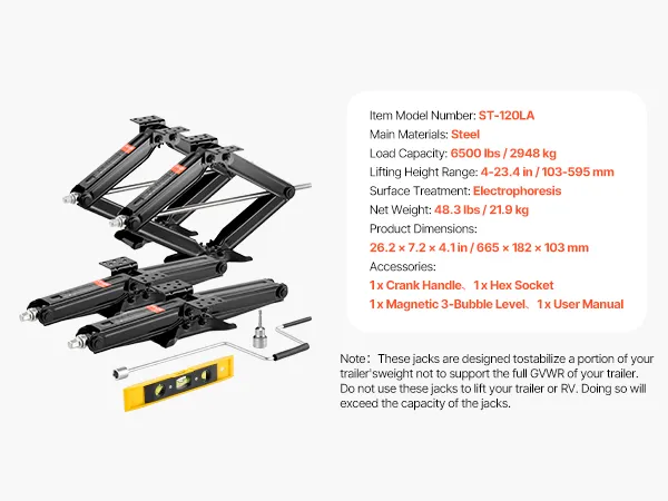 Dieser Scherenstabilisator für Wohnmobile trägt 2948 kg und hat einen Hubbereich von 103 bis 595 mm für stabiles Parken. Hergestellt aus elektrophoretisch behandeltem Stahl, bietet es zuverlässige Unterstützung und ist einfach zu bedienen Solo mit einer erweiterten Handkurbel und einer magnetischen Ebene.
