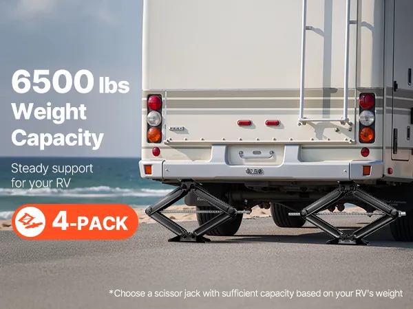 2948 kg Tragkraft: Unser Scherenwagenheber für Wohnmobile bietet eine Tragkraft von 6500 lbs (2948 kg) und eignet sich daher für kleine Wohnmobile der Klasse C sowie für Wohnmobilanhänger der Klassen C und D. Das 4-teilige Design bietet zusätzlichen Halt, ideal für größere Wohnmobile, und verbesserte Stabilität
