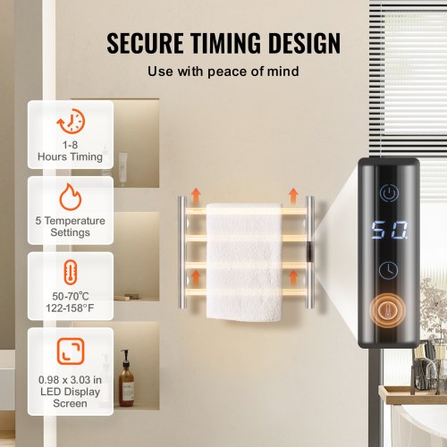 VEVOR Handtuchtrockner Heizkörper Handtuchwärmer, beheizter Handtuchhalter mit 4 Stangen, wasserdichter Handtuchwärmer mit Timer und LED-Anzeige, 5 einstellbare Temperaturstufen, Wandmontage, Silber