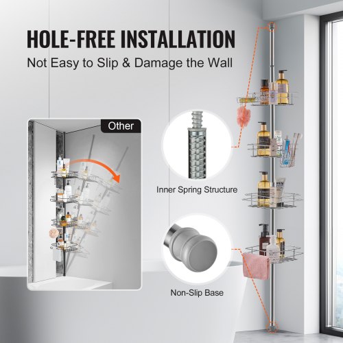 VEVOR Spannstange für Eckduschablage 1067-2896 mm hoch, multifunktionale Spannstange für die Dusche mit starker & tragfähiger Ablage Spannstange für Badezimmer Waschräume Silber 4 Schichten