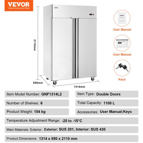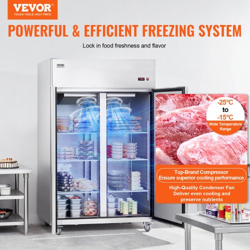 VEVOR Gewerbe-Gefrierschrank 1100 L, Gefrierschrank mit 2 Türen, Edelstahl-Gefrierschrank mit automatischer Abtauung, 6 verstellbaren Ablagen, Temperaturregelung von -25 bis -15 °C und 4 Rädern