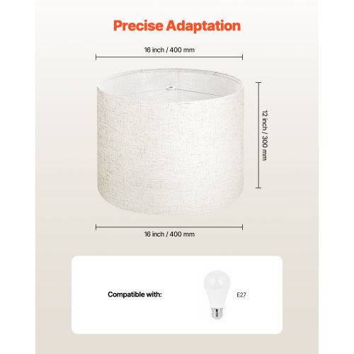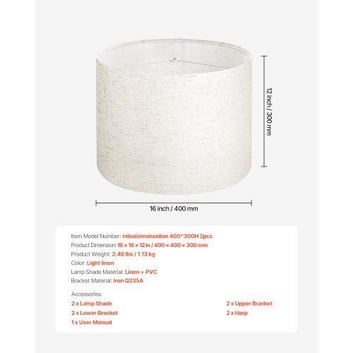 VEVOR Lampenschirm Trommel 40 x 40 x 30 cm (oben x unter x hoch), 2 Stk. Ersatzschirme aus Leinen + PVC, Lampenschirm mit Harfe für Tischlampen Stehlampen Pendelleuchten (helles Leinen)