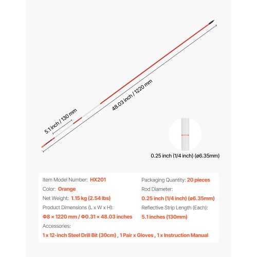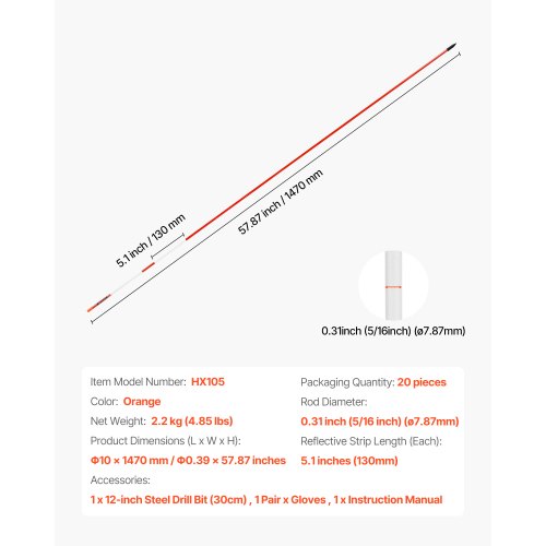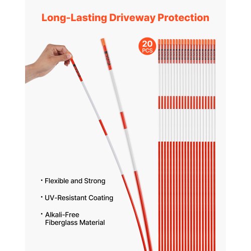 VEVOR Schneestangen, 20 Stk., 147 cm lang, 7,87 mm Durchmesser, Auffahrtstangen mit 30 cm Stahlbohrern, reflektierende Einfahrtsmarkierung, Fiberglasstangen für Parkplätze, Gehwege, Schneeräumen