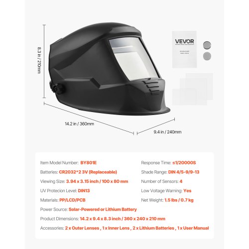VEVOR Automatik Schweißhelm, 100x95 mm True Color, 1/1/1/1 Solar Schweißermaske, 4 Lichtbogensensoren, DIN 4/5–9/9–13, für WIG MIG ARC Schweißen Schleifen Schneiden – METIS-Serie, Schwarz