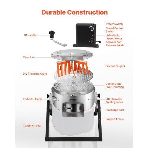 VEVOR 482,6 mm Erntemaschine Manuell Trimmer Blattschüssel-Trimmer mit Netztasche und 3 Arten von Edelstahl-Klingen zum Schneiden von nasse/trockene Pflanzen Tumble Cutter Bowl Erntemaschine Grow
