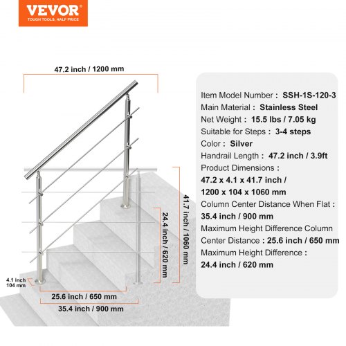 VEVOR Handläufe für Außentreppen, 47,2 Zoll Länge, 3 Querstangen, Treppenhandlauf-Set, Übergangsgeländer aus Edelstahl mit Montagesatz, doppelsäulige Treppenhandläufe für Senioren, Veranda und Terrasse