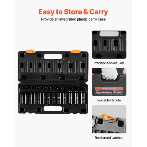 VEVOR 1/2 Zoll Steckschlüsselsatz CR-V-legierter Stahl 33-tlg Steckschlüssel Satz 10-24 mm Tiefe Stecknüsse Schlagschrauber, HRC 42-48 Steckschlüssel inkl Werkzeugkoffer, Metrisch Schraubenausdreher